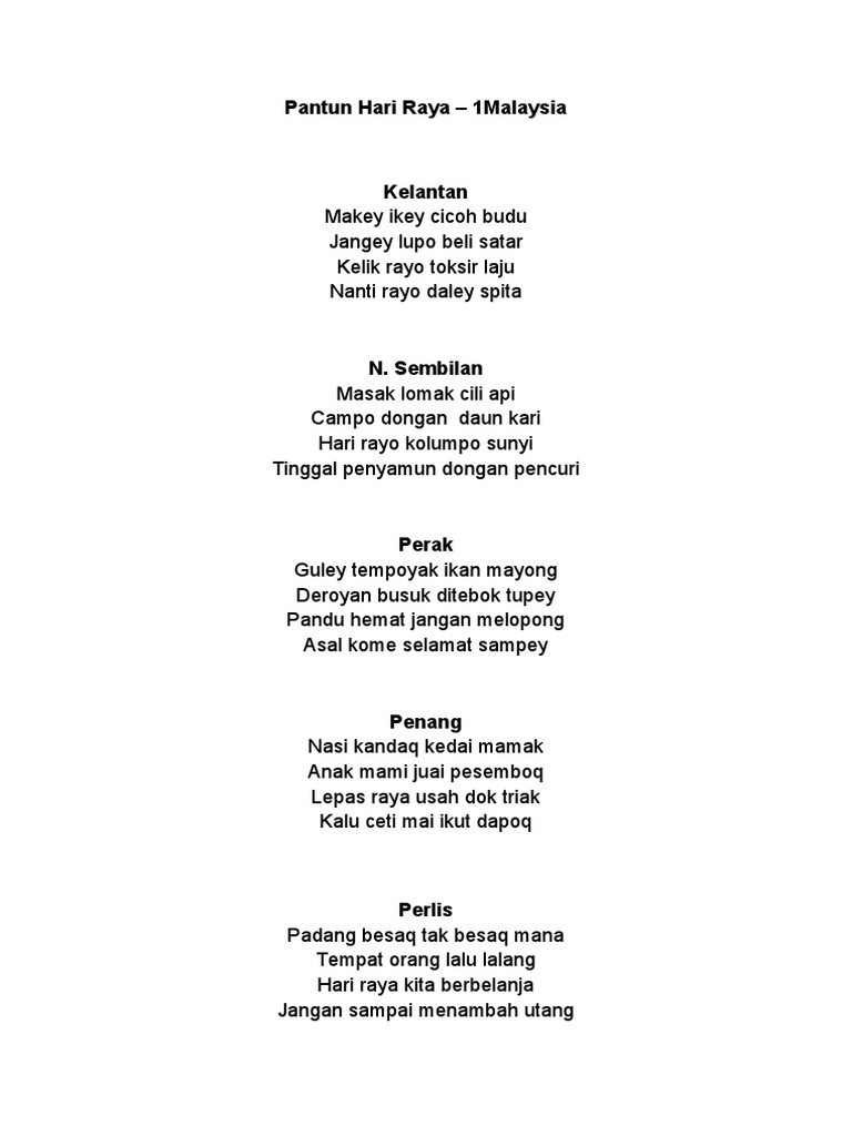Kelantan Make ikke cicoh budu Jange lupo tamboh satar Kelik rayo toksir laju Nanti rayo dale sepita Melaka. Pantun Lucu Lawak Jenaka Pasti Anda Ketawa. PANTUN RAYA MENGIKUT NEGERI-NEGERI HABACA PANTUN NI DENGAN NADA DAN INTONASI YANG BETUL.